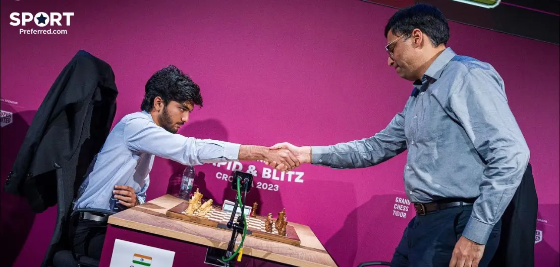 They played five times — Anand won two, two games were drawn, and Gukesh won the final blitz game.