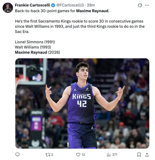 Raynaud’s back-to-back 30-point games placed him in elite company among Sacramento rookies.